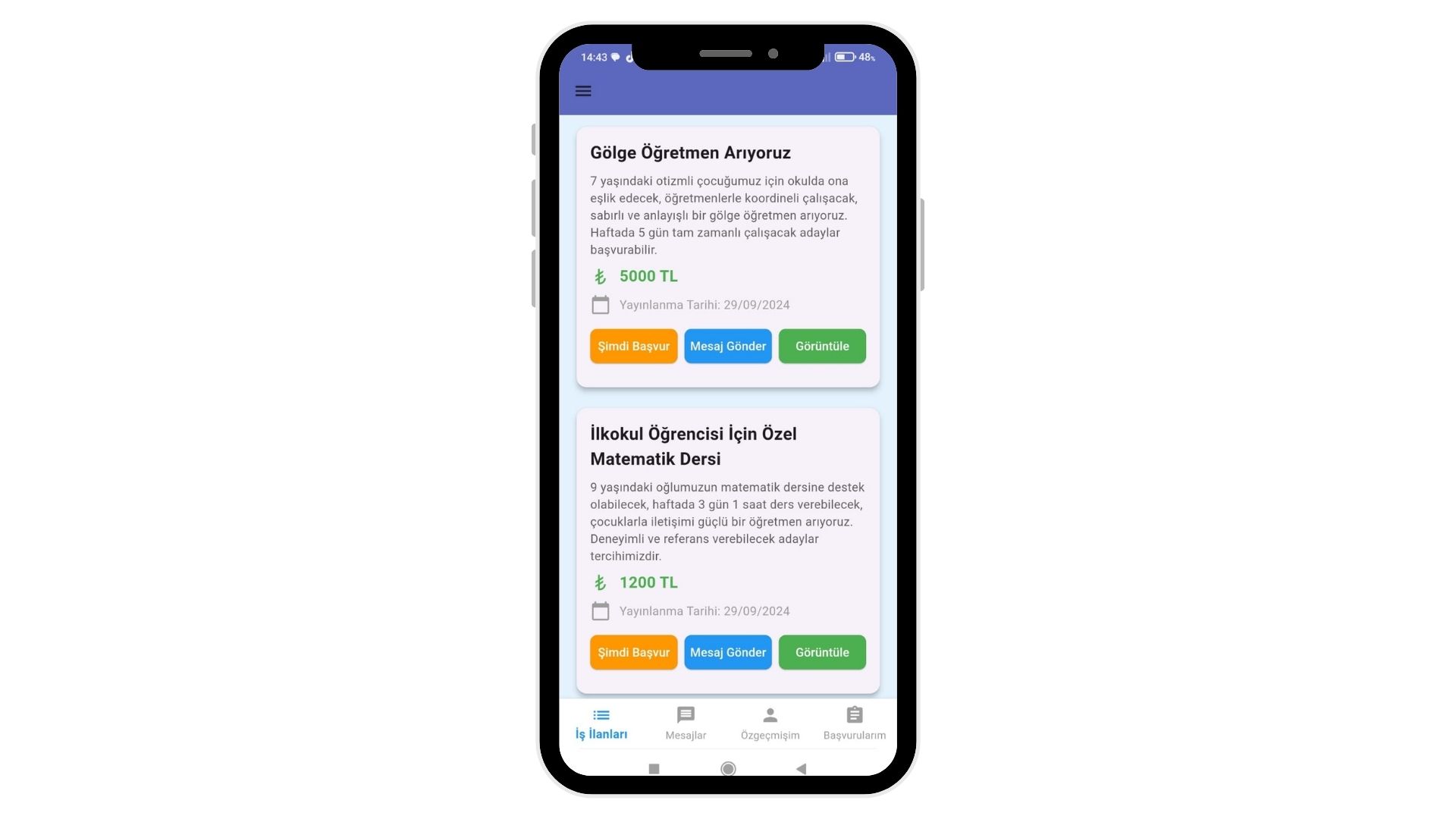 Uygulama içerisinde; ilan yönetimi, başvuru sistemi, mesajlaşma altyapısı ve kullanıcı profilleri gibi temel fonksiyonlar entegre edilerek uçtan uca bir platform deneyimi sunulmuştur.