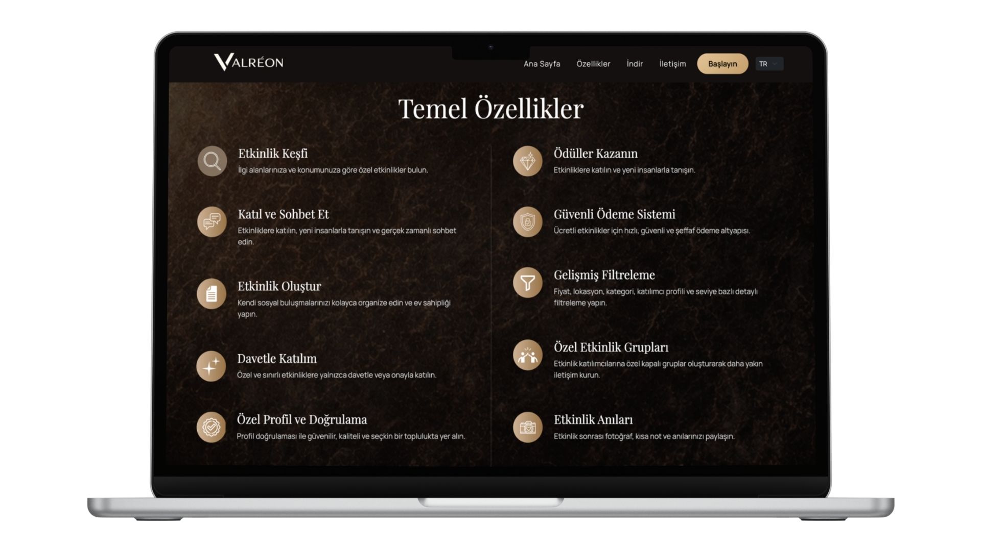 Valreon mobil uygulaması için geliştirilen bu tanıtım web sitesi, platformun sunduğu premium etkinlik deneyimini dijital ortamda en etkili şekilde yansıtmak amacıyla tasarlanmıştır. Kullanıcıların uygulamayı indirmeden önce konsepti anlamasını, etkinlikleri keşfetmesini ve platforma güven duymasını sağlayan modern ve dönüşüm odaklı bir yapı oluşturulmuştur.