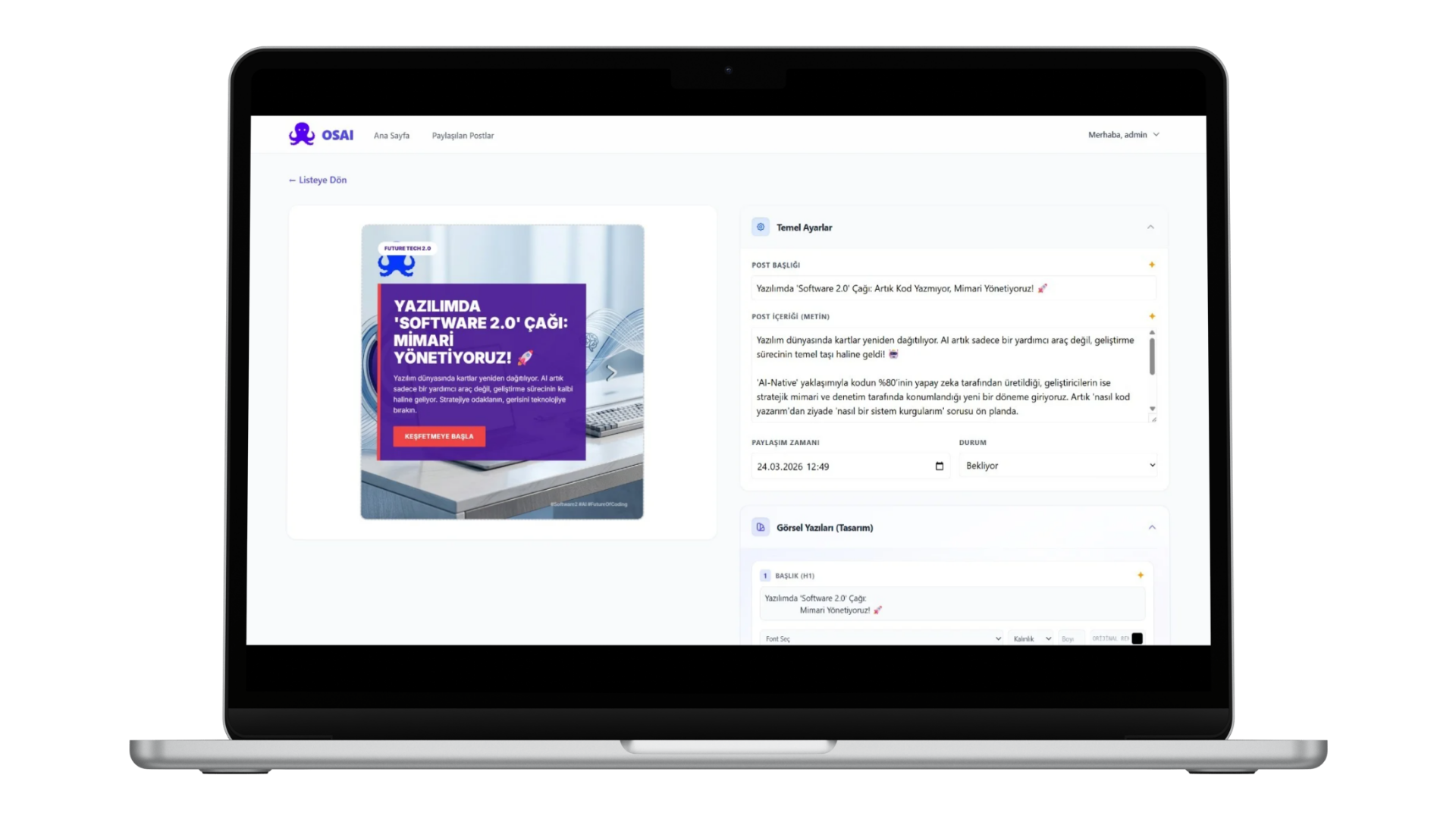 Platform, kullanıcıların yalnızca kısa bir konu veya fikir girmesiyle; görsel metinleri, başlıkları ve açıklamaları otomatik olarak oluşturarak yüksek kaliteli sosyal medya postları üretmesini sağlar.